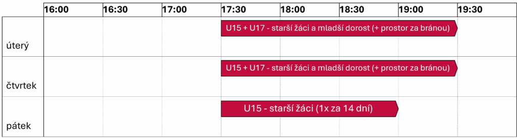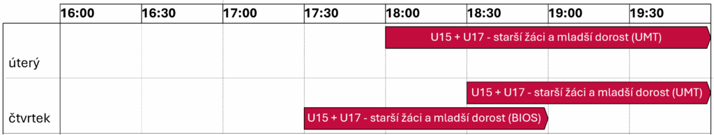U14-15 Starší žáci Tréninky PODZIM / JARO ZIMA * Společně se staršími mohou trénovat i ročníky 2013 a 2014, které nám pomáhají v mistrovských zápasech